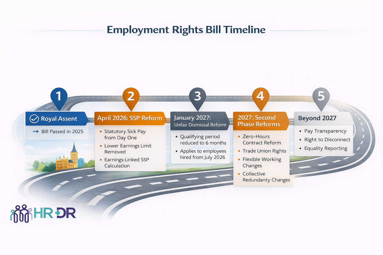 The Employment Rights Act 2025 is being implemented in phases. The first confirmed change, SSP from day one and removal of the lower earnings limit, takes effect on 6 April 2026. The reduction of the unfair dismissal qualifying period from two years to six months applies to dismissals from 1 January 2027. Zero-hours contract reforms and other provisions are expected to follow in 2027, subject to consultation and commencement orders.
